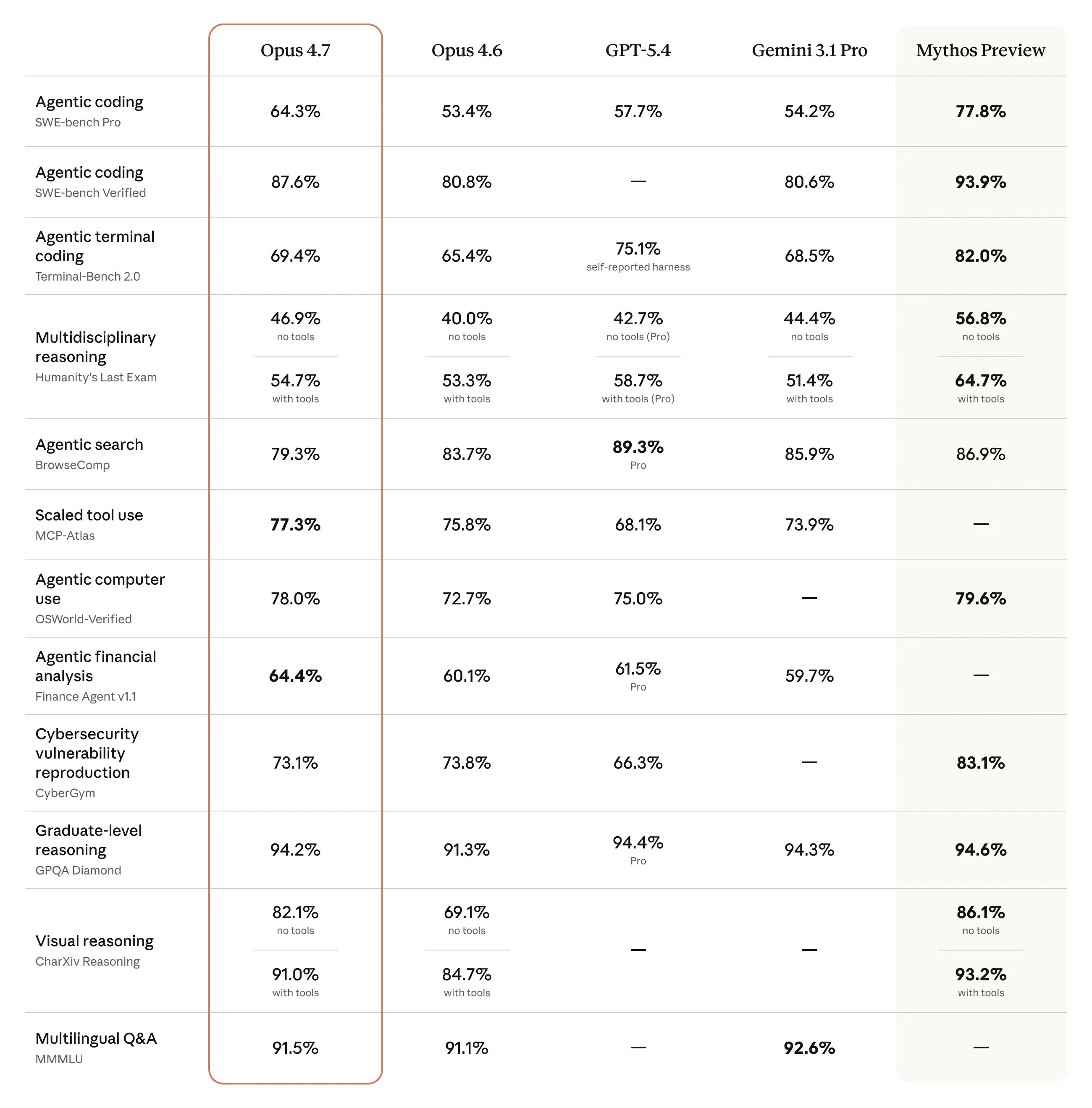 There is also what the announcement does not say out loud. Mythos Preview, the higher-tier model, scores 77.8% on SWE-bench Pro versus 64.3% for Opus 4.7. Anthropic is keeping it under wraps because of Project Glasswing and is testing its cyber safeguards on Opus 4.7 before releasing the rest. Reasonable translation: what we get today is already very good, and it is intentionally the second-best option in the catalog. The "state-of-the-art" label is deserved. It is also, incidentally, the price to pay for us to forget that the truly interesting version stays locked up.